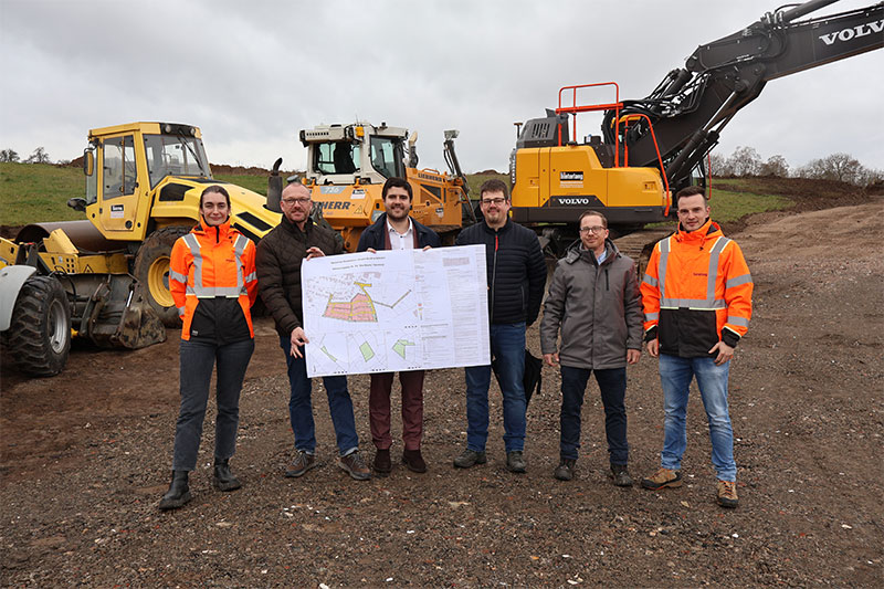 Seit einigen Tagen rollen die Baumaschinen in Burkhardsfelden. Am Mittwoch, den 11. März 2026 trafen Bürgermeister Tobias Breidenbach, Ortsvorsteher Ingo Rühl, Vertreter des Vorhabenträgers Geißler Infra GmbH sowie Vertreter des Bauunternehmens Hinterlang GmbH & Co. KG zusammen, um offiziell den Beginn der Erschließungsarbeiten für das neue Baugebiet zu markieren.