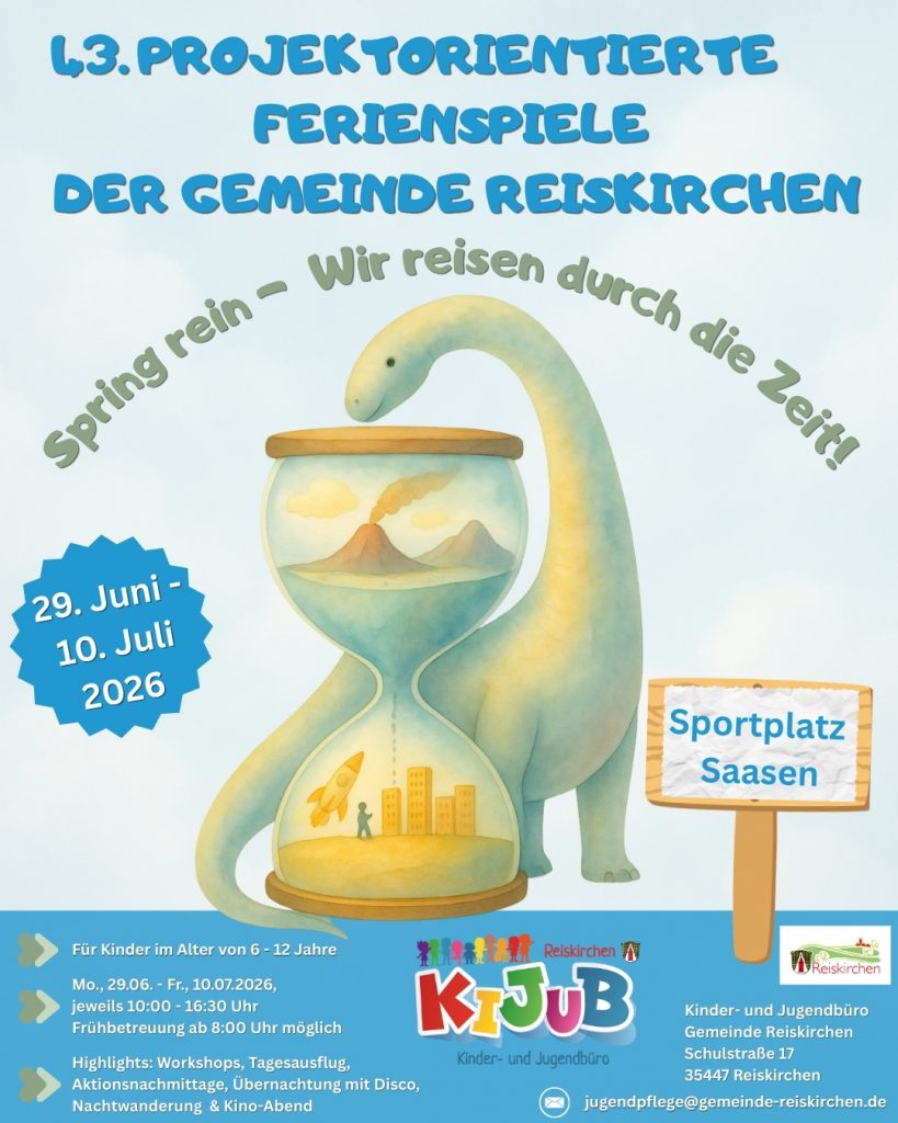Wie in jedem Jahr finden in den ersten beiden Sommerferienwochen (29. Juni bis 10. Juli 2026) die projektorientierten Ferienspiele statt. Unser diesjähriges Motto lautet: „Spring rein – wir reisen durch die Zeit!“.
